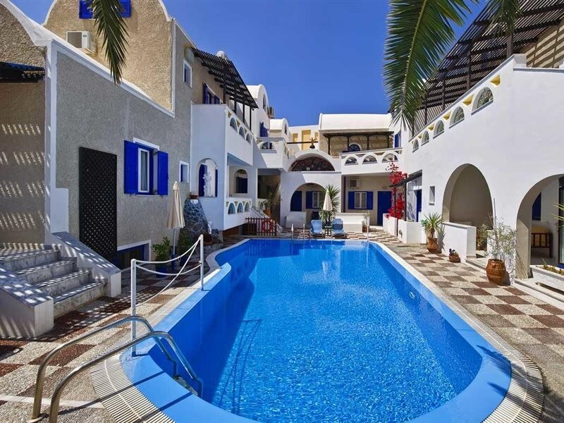 Location: The hotel is situated very close to the most famous black sandy beaches of the island. The town centre of Perissa and the commercial area are only 150 m away and offer a variety of options for shops, traditional markets and restaurants. Santorini Airport is about 15 km from the hotel. Facilities: Guests can enjoy the pleasant ambience of one of the 30 studios. The friendly staff at the reception desk are happy to answer any questions. Services and facilities include a safe, a TV room, room service, an alarm call service and a conference room. Wireless internet access is provided in public areas. Everyday necessities can be purchased at the supermarket. Guests arriving by car can park their vehicles in the car park. Rooms: Air conditioning and individually adjustable heating ensure that rooms maintain comfortable temperatures. Some rooms have a balcony, which gives guests additional space for rest and relaxation. Rooms include a double bed. Valuables can be securely stored in a safe. The kitchenette comes with a refrigerator and a tea/coffee station. A direct dial telephone, a television with satellite/cable channels and WiFi (no extra charge) provide all the essentials for a comfortable holiday. Bathrooms are equipped with a shower and a bathtub, as well as a hairdryer. The apartment hotel has non-smoking rooms. Sports/Entertainment: The sports and entertainment facilities at the hotel ensure that guests have plenty of activities to choose from during their stay. Guests can enjoy a refreshing swim in the outdoor pool area. Guests can relax and enjoy the sun loungers and parasols provided. A variety of refreshing drinks await guests at the pool bar. There are many ways to relax or stay active at the hotel, including cycling/mountain biking, surfing and a gym. Entertainment options and leisure facilities include a dance club and a nightclub. Copyright GIATA 2004 - 2025. Multilingual, powered by www.giata.com for client no. 125352 Meals: The dining area includes a restaurant and a bar. Bed and breakfast can be booked. A continental breakfast guarantees a great start to the day. Payment: The apartment hotel accepts the following credit cards: VISA and MasterCard.